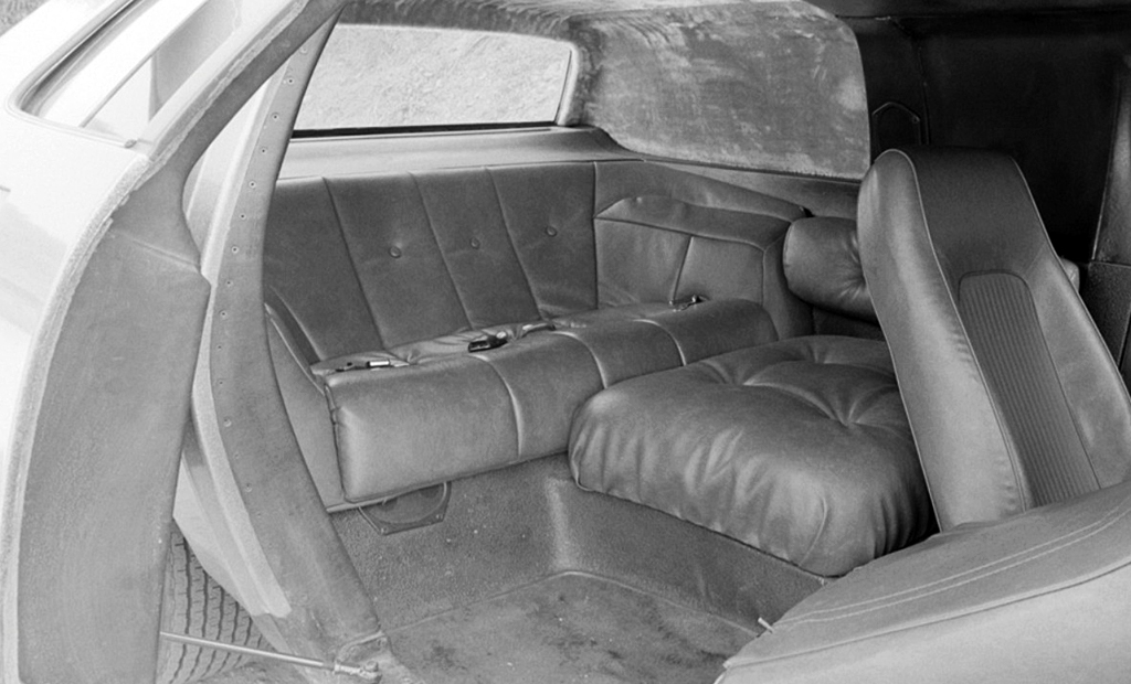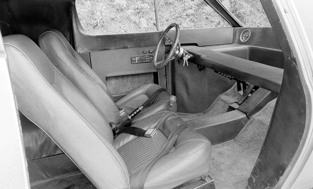 L’habitacle nous ramène aux années 70! Le tableau de bord minimaliste et très peu ergonomique et, surtout, le siège arrière de style lounge, en sont de beaux exemples. Le pouf, placé devant le siège, cache en réalité le réservoir d’essence.