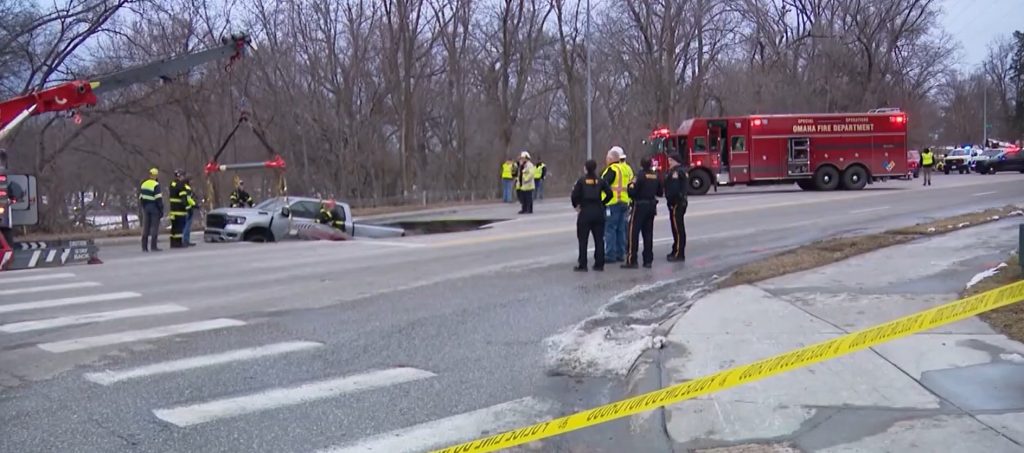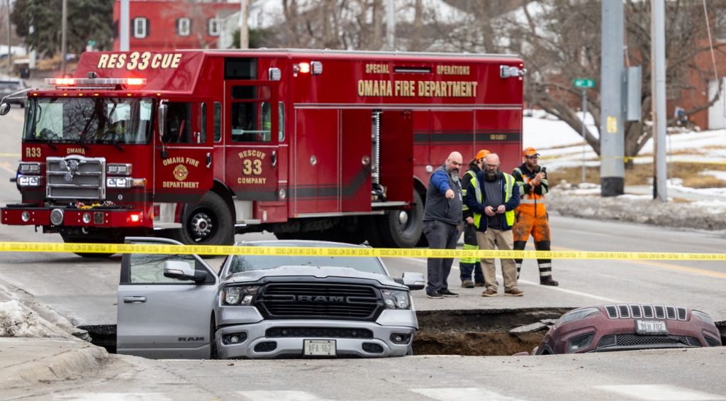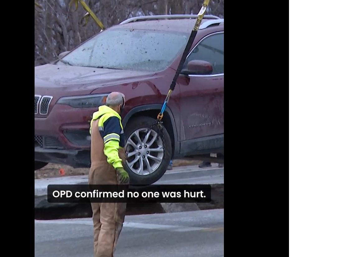 La scène s’est récemment passée à Omaha, au Nebraska, alors que deux véhicules qui attendaient sagement au feu rouge ont été engloutis dans la chaussée!
