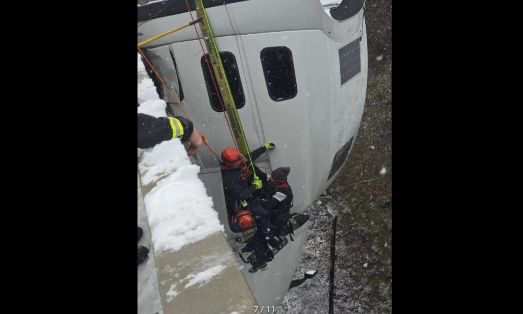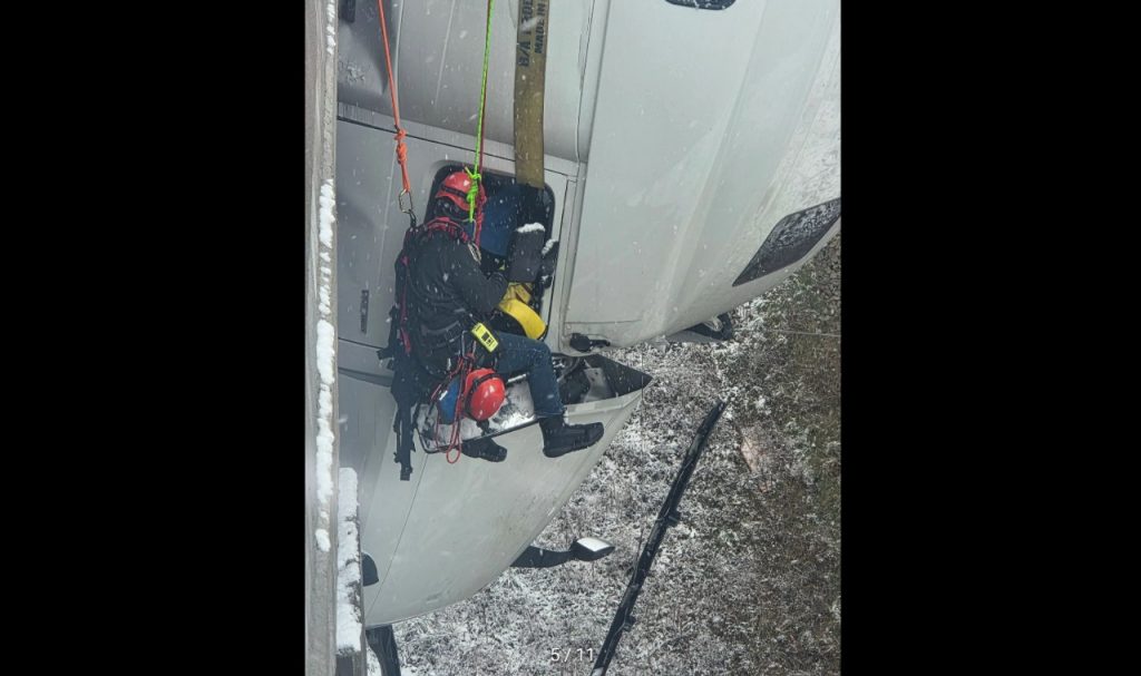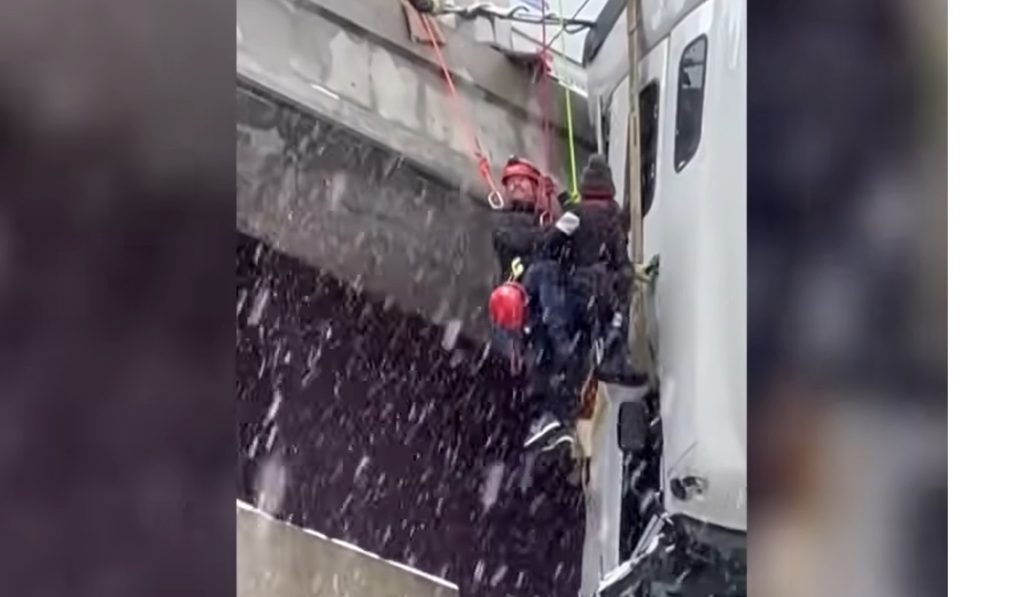 Il a fallu environ 5 heures pour sortir l’infortuné conducteur de sa précaire position. Après avoir réussi à ‘’strapper’’ la cabine et à l’arrimer à une grue pour l’empêcher de basculer dans le vide, un premier répondant, lui aussi attaché à une grue, a pu descendre jusqu’à la cabine pour aller secourir notre involontaire cascadeur.